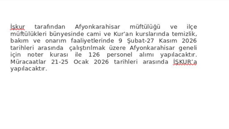 İşkur tarafından Afyonkarahisar müftülüğü ve ilçe müftülükleri bünyesinde cami ve Kur’an kurslarında temizlik, bakım ve onarım faaliyetlerinde 9 Şubat-27 Kasım 2026 tarihleri arasında çalıştırılmak üzere Afyonkarahisar geneli için noter kurası ile 126 personel alımı yapılacaktır. Müracaatlar 21-25 Ocak 2026 tarihleri arasında İŞKUR’a yapılacaktır.
