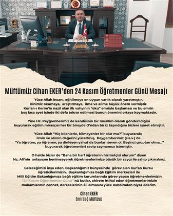 Geleceğimizi inşa eden, Başkanlığımız bünyesinde görev alan Kur’an Kursu öğreticilerimizin, Başkanlığımıza bağlı Eğitim merkezleri ile Milli Eğitim Bakanlığımıza bağlı eğitim kurumlarında görev yapan öğretmenlerimizin “24 Kasım Öğretmenler Günü” nü kutlar, ahirete irtihal eden öğretmenlerimizin makamlarının cennet, derecelerinin âli olmasını yüce Rabbimden niyaz ederim.