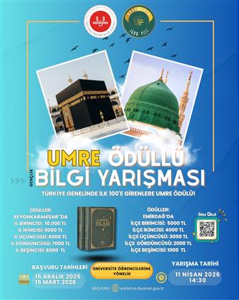 ÜNİVERSİTE ÖĞRENCİLERİNE YÖNELİK UMRE ÖDÜLLÜ BİLGİ YARIŞMASI DETAYLI BİLGİ VE BAŞVURU İÇİN: http://yarisma.diyanet.gov.tr/