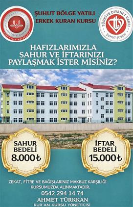 İlçemiz Müftülüğüne bağlı Emine Erdoğan Yatılı Kız Kur'an Kursu ve Bölge Yatılı Erkek Kur'an Kursu öğrencilerimiz ile Sahur ve İftarınızı paylaşmak isterseniz İlçe Müftülüğümüz ve Kurs Yöneticileri ile irtibata geçebilirsiniz.